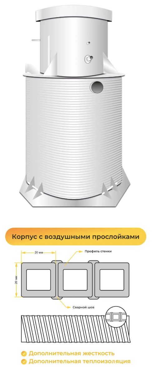 Благодаря цилиндрической форме и ребрам жесткости исключается повреждение корпуса при размещении в котловане. Он не ломается и не теряет герметичность из-за давления грунта снаружи и нагрузки от воды внутри. Отсутствие углов снижает внешнее воздействие, что дополнительно способствует сохранности емкости. Грунтозацепы в нижней части исключают его всплытие из-за повышения уровня грунтовых вод и вспучивания почвы.